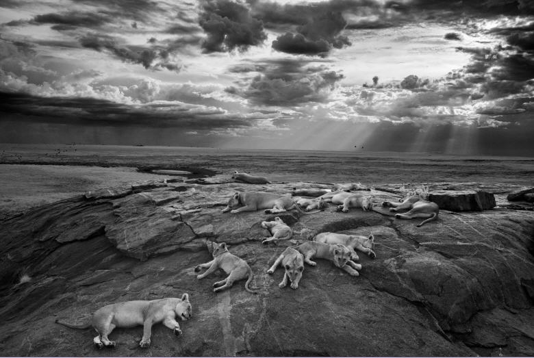 Here the five females of the Vumbi pride lie at rest with their cubs on a rocky outcrop in Tanzania’s Serengeti National Park. They were used to Nick’s presence – he had been following them for six months. Making use of a specially made hole in the roof, he slowly stood up to frame the vista. He photographed them in infrared, which he says “cuts through the dust and haze, transforms the light and turns the moment into something primal, biblical almost.