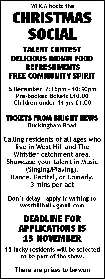 Talking of Christmas Socials, there’s another one on Saturday 5 December – see details in the panel below. West Hill’s got talent and we want to showcase it. We’re looking for 15 acts who can entertain us on the evening and win a prize into the bargain. Don’t hide your talents – share them with West Hill. Apply in writing to Colette at westhillhall@gmail.com telling us about your act and why “it will mean the world to you” if you could perform on 5 December 2015.
