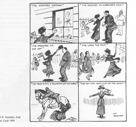 In 1903 Mrs Pankhurst decided to break with the NUWSS and set up a separate society, to include younger and working class women. This became known as the Women’s Social and Political Union (WSPU). Their motto was “deeds not words” and violence, hunger strikes and law-breaking became part of their campaign tactics.