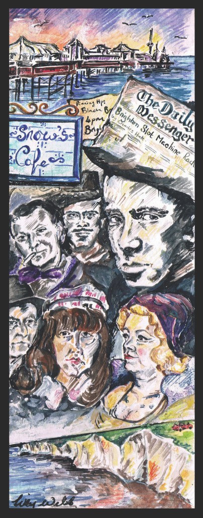 The pictures focused on two themes: individuals and small groups in everyday moments: in the garden, the park, the pub, the station; and very detailed, almost miniaturist, paintings, 8” x 3”, illustrating a novel or play. The second were sold as cards in bookmark format, with a quotation from the book on the back where copyright law allowed. They sold well, and, maybe predictably, most popular was the one suggested by ‘Brighton Rock’ (shown here). The ‘Importance of Being Earnest’ ran it a close second, the quote on the back seemed to appeal strongly to school and university teachers: “The whole theory of modern education is radically unsound. Fortunately, in England at any rate, education produces no effect whatsoever.” Now Lily is in discussion with the Jubilee Library about offering the bookmarks for sale, and with a Gallery in Alfriston about selling her originals. Fingers crossed!