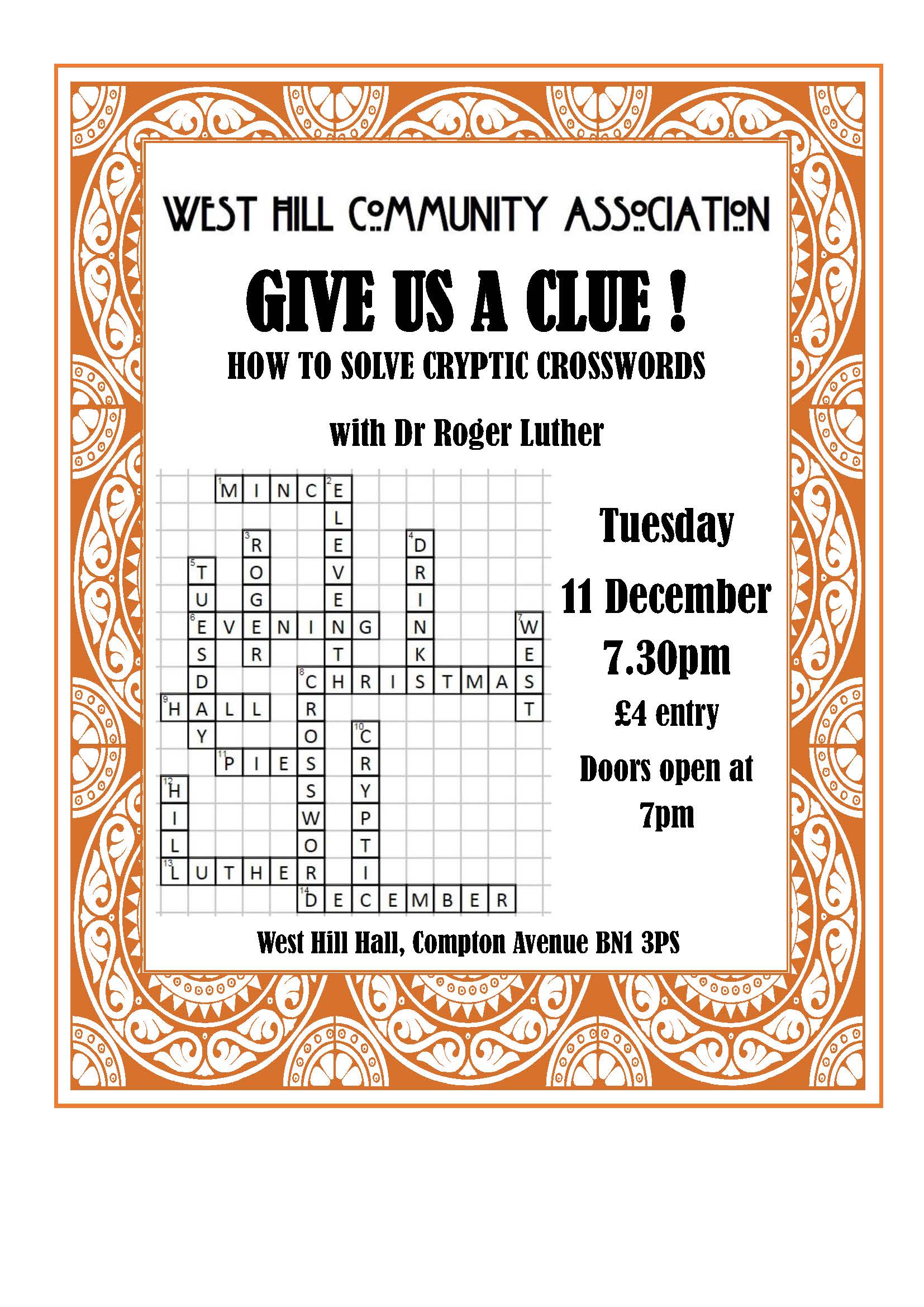 We are skipping the Christmas Social this year but have three events coming up, as well as the increasingly popular monthly Quiz, where we had a capacity house in July, and put the FUN firmly into fundraising. On Tuesday 9 October  we continue our local history talks, with Jackie  Marsh-Hobbs giving us an insight into the history of Palmeira Mansions. On Saturday 24 November a Grand Christmas Sale will be held in the Hall between 10am and 3pm, with stalls offering a mixture of craft, gifts, books and bric-a-brac. On Tuesday 11 December Roger Luther is going to help us to solve cryptic crosswords. We want to keep West Hill minds ticking over into the holiday season so come and share some early festive cheer and delve into the tricks and tips to crack any cryptic clue.