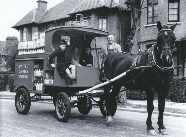 Joan told me that she remembers a lovely milkman who allowed her to sit on the footplate of his horse and cart and travel down Albert Road while he delivered fresh milk daily from large milk churns to customers’ jugs and small churns. She said, “When we got to the bottom of the road I used to jump off and run back home.”