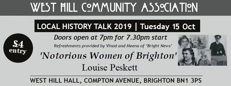Although we bade a fond farewell to WHCA Trustee Dorothy Lamb in September (she’s moved back home to Birmingham) the popular local history talks which she organised, continue this Autumn with Louise Peskett, who will present ‘Notorious Women of Brighton’. Wilful princesses, music hall stars, headstrong courtesans, suffragettes, entrepreneurs: Brighton has always attracted women who dare to do things differently. Hear some of their stories and other female claims to fame at West Hill Hall on 15 October at 7.30pm.
