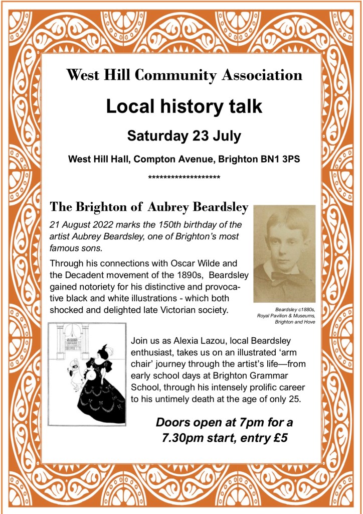 To celebrate his 150th birthday, Alexia Lazou, a local Beardsley enthusiast, will present an illustrated talk exploring the buildings and places associated with the artist’s early life, including his birthplace in Buckingham Road, the Annunciation church and Brighton Grammar School.
