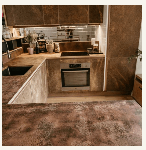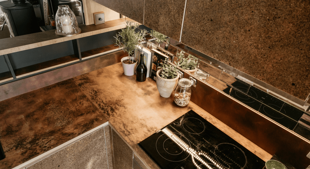 We had the worktops done, the kitchen island and the dining table, and went for a copper sheen finish that looks great and always gets comments. It’s hard-wearing, waterproof, almost completely heatproof and can be made to any size or shape. It also cost about a third of what we were quoted in the high street.