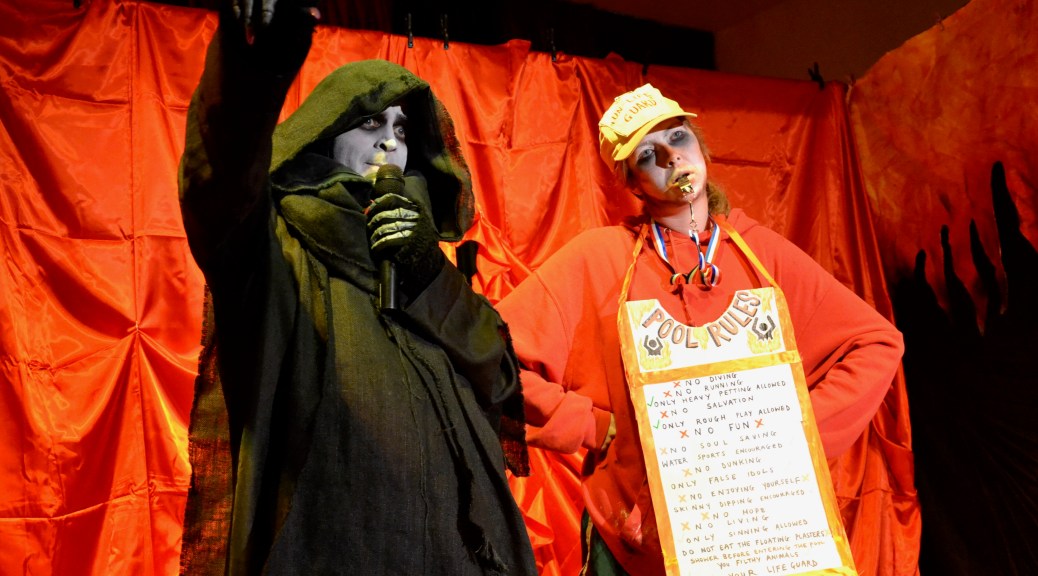 The regular club host is Jon Griffin, who does an uncanny impression of Death from Ingmar Bergman’s The Seventh Seal. Jon writes his own satirical monologues for the shows, and is so good at being Death that he has since taken the character into stand-up comedy clubs. He’s a composer, like Stuart, and they co-write the songs for the shows.