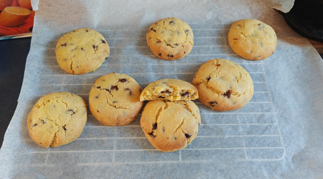 Divide the mixture into 10 balls, arrange on a baking sheet. Make sure to leave space between each biscuit, as they can spread. Squish each ball down, so that they are mostly flat so that they will bake evenly.