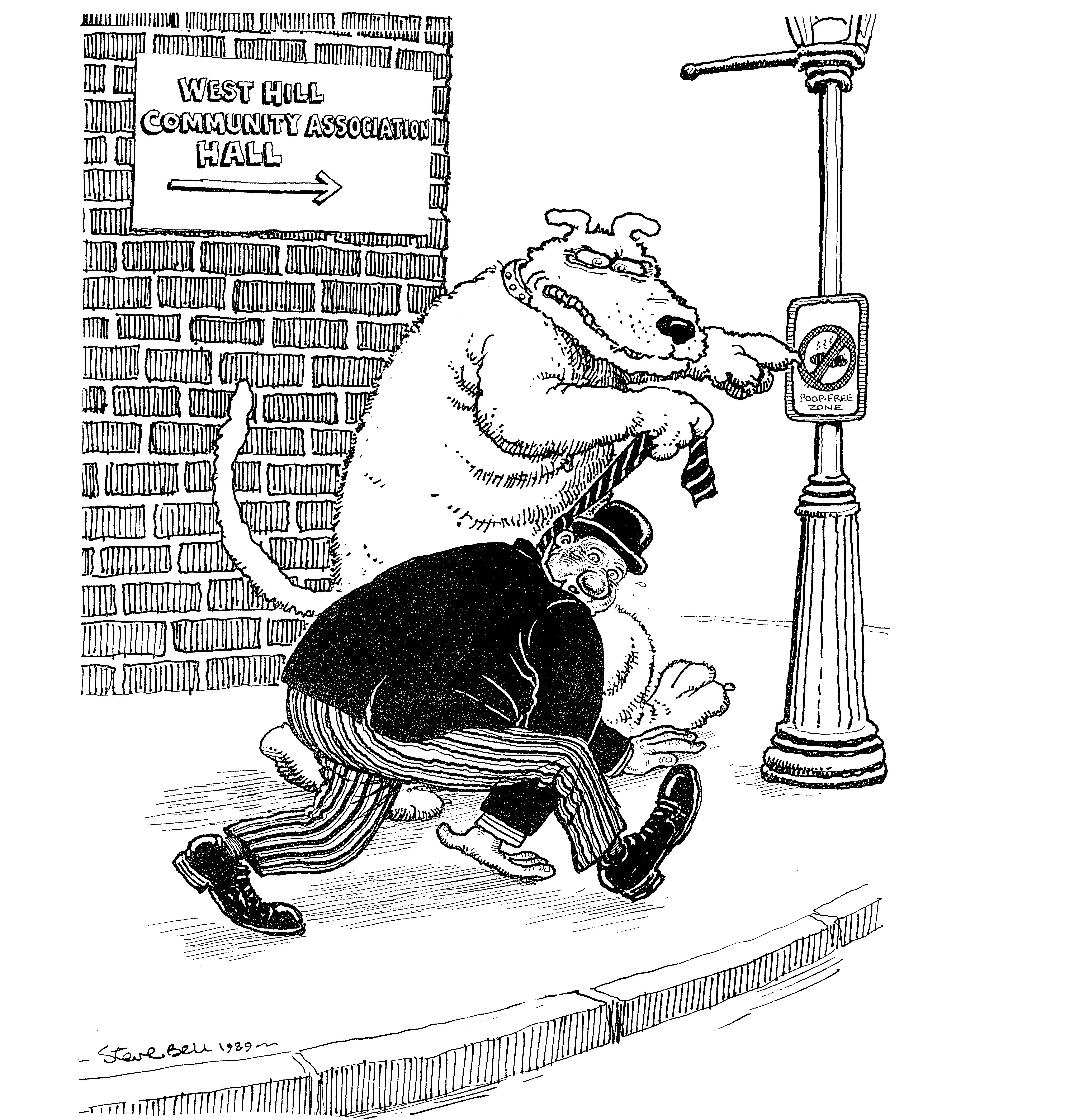 The Brighton Good Dog Campaign started with a leaflet through everybody’s letter box, naming West Hill Community Association as a sponsor. The intention was to install a poop bin and pay for it to be emptied for a year, at an estimated cost of £250. In order to raise funds the Committee asked Steve Bell to design a poster which could be sold. Steve Bell is known nationally as a prolific cartoonist, published in The Guardian. As you can see, Steve did an excellent job. He produced the poster in a limited edition and it was used to raise funds and get the message across the dog owners.