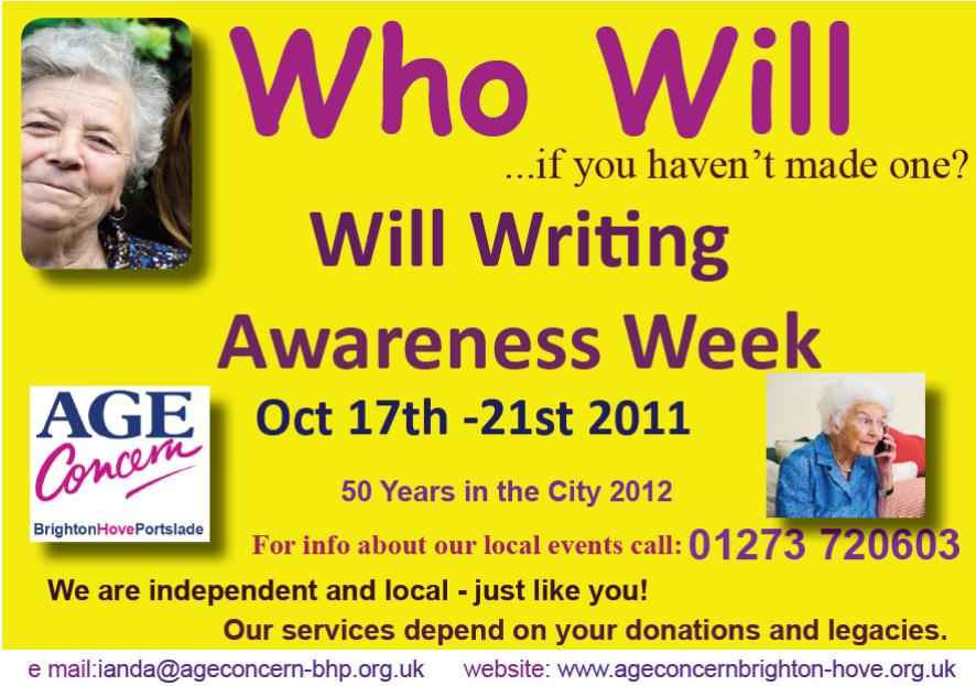 Age Concern Brighton Hove & Portslade is holding their annual Will Writing Awareness Week in partnership with lawyers across the City, beginning on Monday 17 October. Lawyers will be offering appointments for free simple will writing at their own premises and they will be available to answer questions at Age Concern Information & Advice Outreach venues. There will be Q and A sessions at Age Concern Brighton Hove & Portslade offices at the Seven Dials.