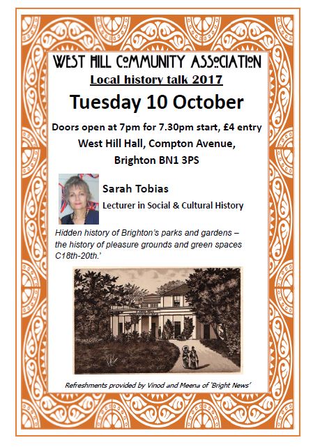 Our next talk is on Tuesday 10 October with Sarah Tobias, an entertaining lecturer in cultural, local and social history. She will be presenting ‘Hidden history of Brighton’s parks and gardens – the history of pleasure grounds and green spaces C18th-20th.’